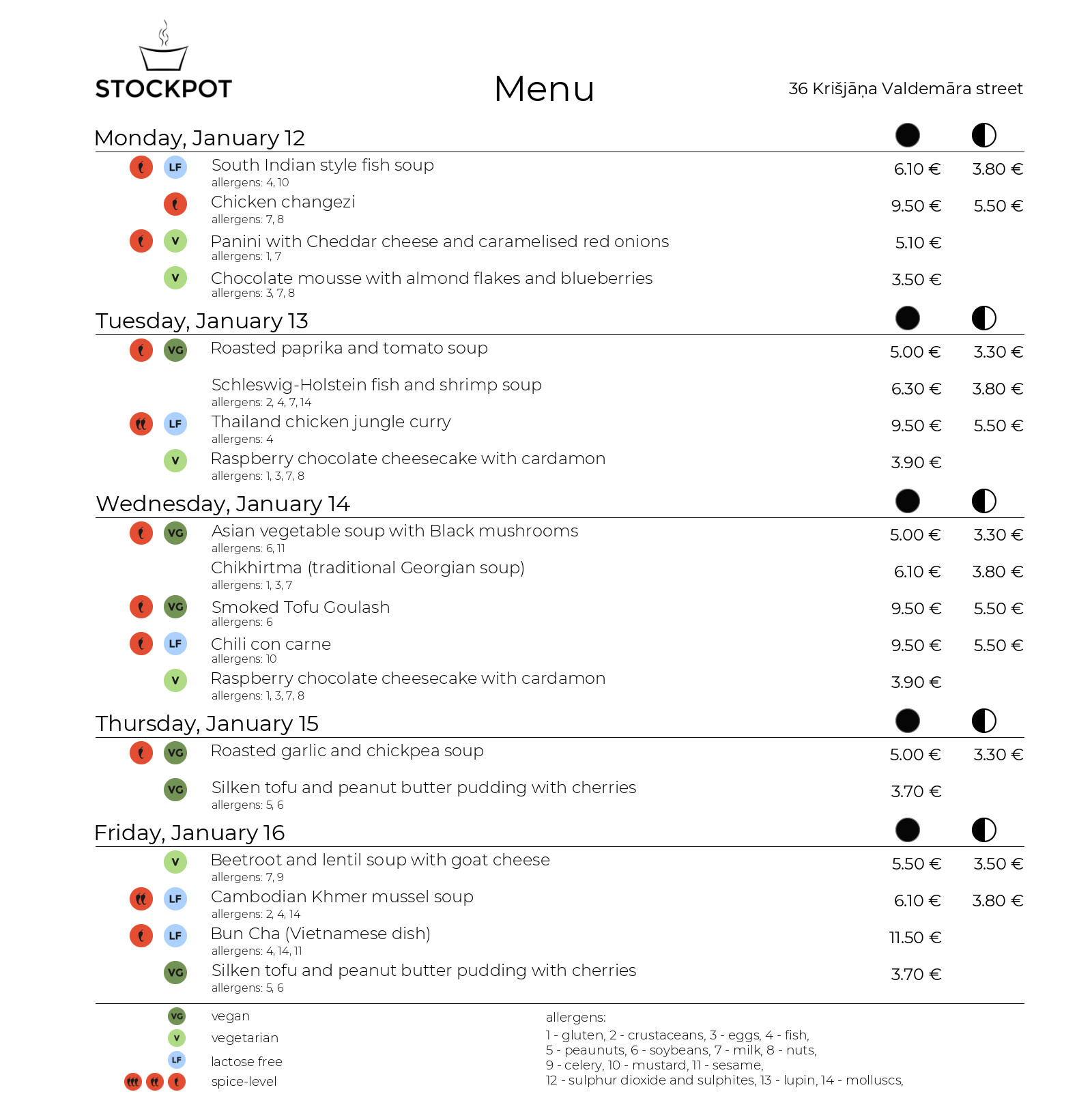 1 - gluten, 2 - crustaceans, 3 - eggs, 4 - fish, 5 - peaunuts, 6 - soybeans, 7 - milk, 8 - nuts, 9 - celery, 10 - mustard, 11 - sesame, 12 - sulphur dioxide and sulphites, 13 - lupin, 14 - molluscs