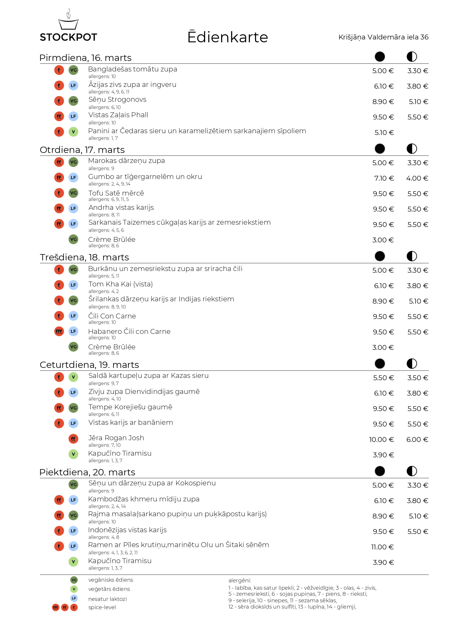 1 - labība, kas satur lipekli, 2 - vēžveidīgie, 3 - olas, 4 - zivis, 5 - zemesrieksti, 6 - sojas pupiņas, 7 - piens, 8 - rieksti, 9 - selerija, 10 - sinepes, 11 - sezama sēklas, 12 - sēra dioksīds un sulfīti, 13 - lupīna, 14 - gliemji