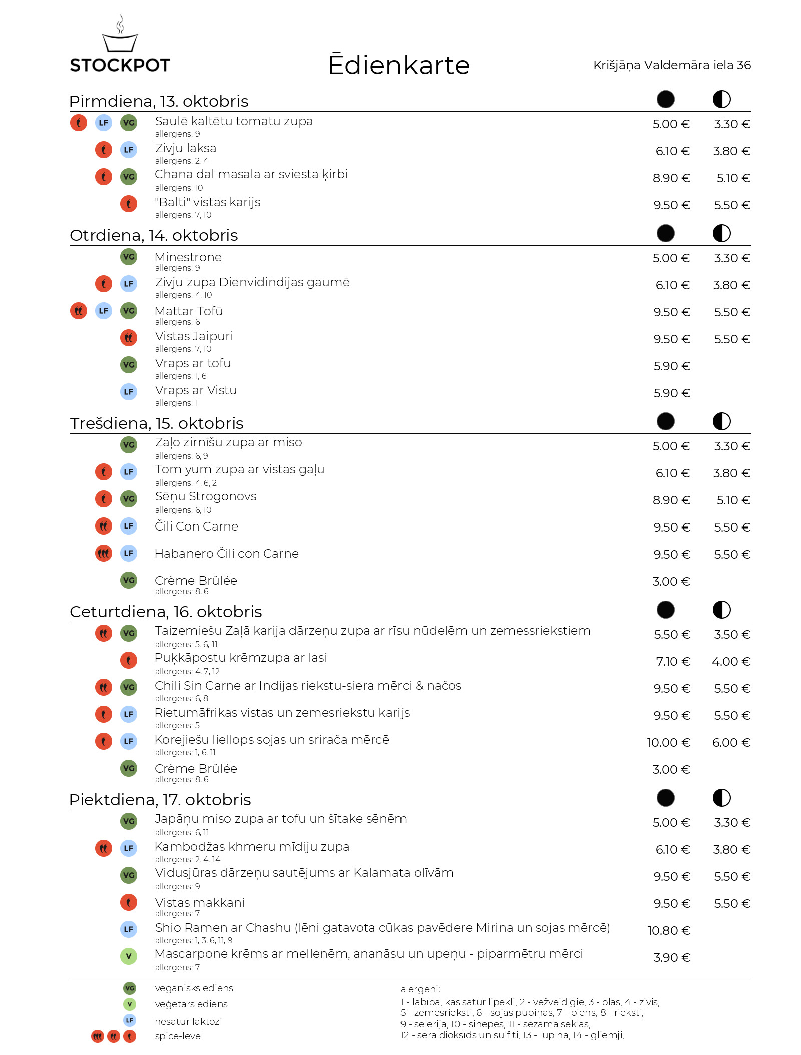 1 - labība, kas satur lipekli, 2 - vēžveidīgie, 3 - olas, 4 - zivis, 5 - zemesrieksti, 6 - sojas pupiņas, 7 - piens, 8 - rieksti, 9 - selerija, 10 - sinepes, 11 - sezama sēklas, 12 - sēra dioksīds un sulfīti, 13 - lupīna, 14 - gliemji